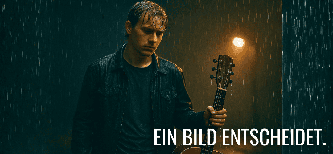 Plötzlich taucht ein Bild auf: Ein junger Mann steht im Regen, hält eine Gitarre in der Hand, die Saiten tropfnass.